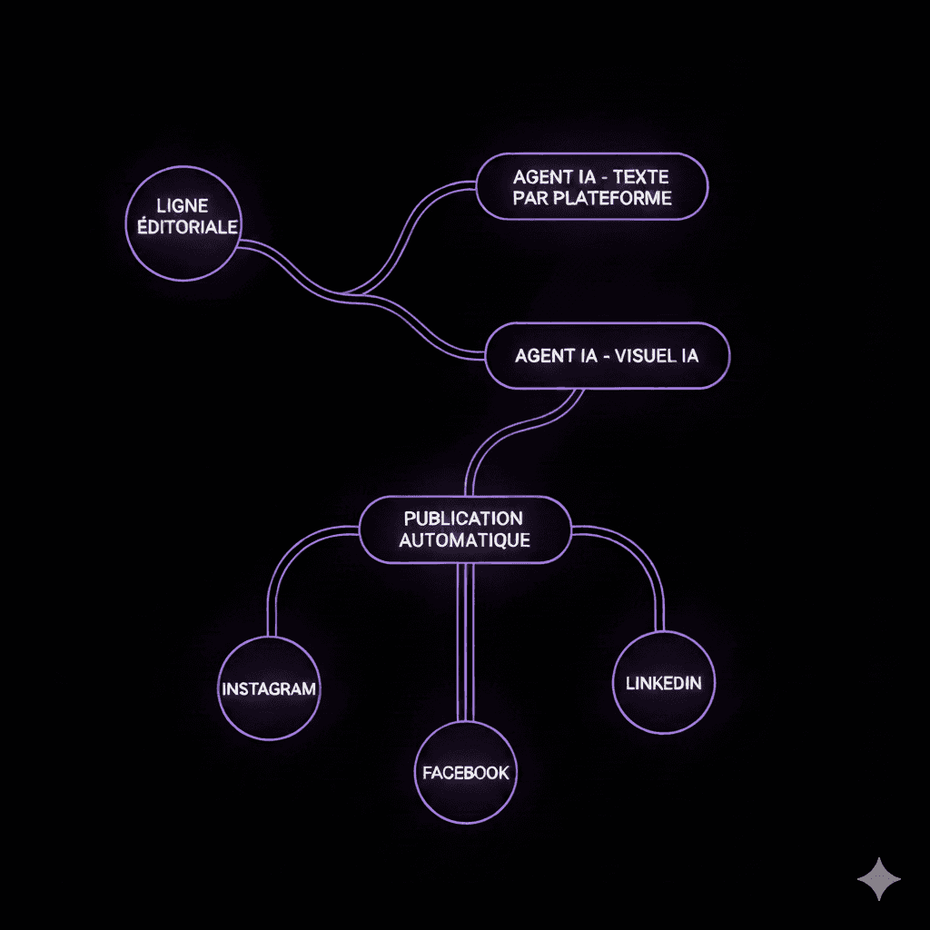 À partir d’une ligne éditoriale et d’une charte graphique définies, l’IA génère un visuel cohérent pour chaque post, ainsi qu’un texte adapté à Instagram, Facebook et LinkedIn (hashtags, ton, longueur, call-to-action).