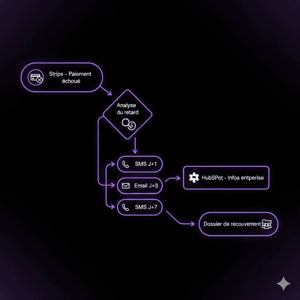 À chaque tentative échouée, une séquence intelligente SMS + emails personnalisés se déclenche selon le niveau de retard (J+1, J+3, J+7…).